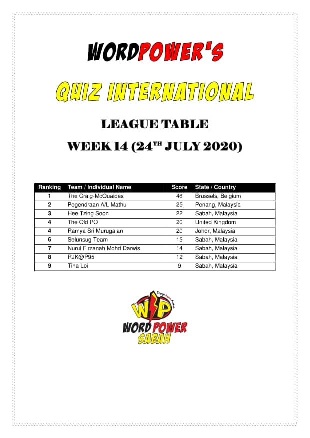 Our quizzes are now well into double figures, and we have people taking part from Sarawak, Australia, UK, Belgium as well as Sabah, so it's really travelling. Keep it up, and so will we! Now more than 20 teams take part, and the number is growing. Thank you Nick Pang for devising many of the questions and to Ben Uzair for reading them with me.